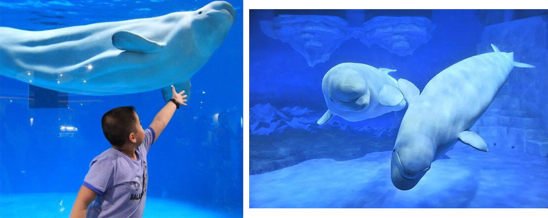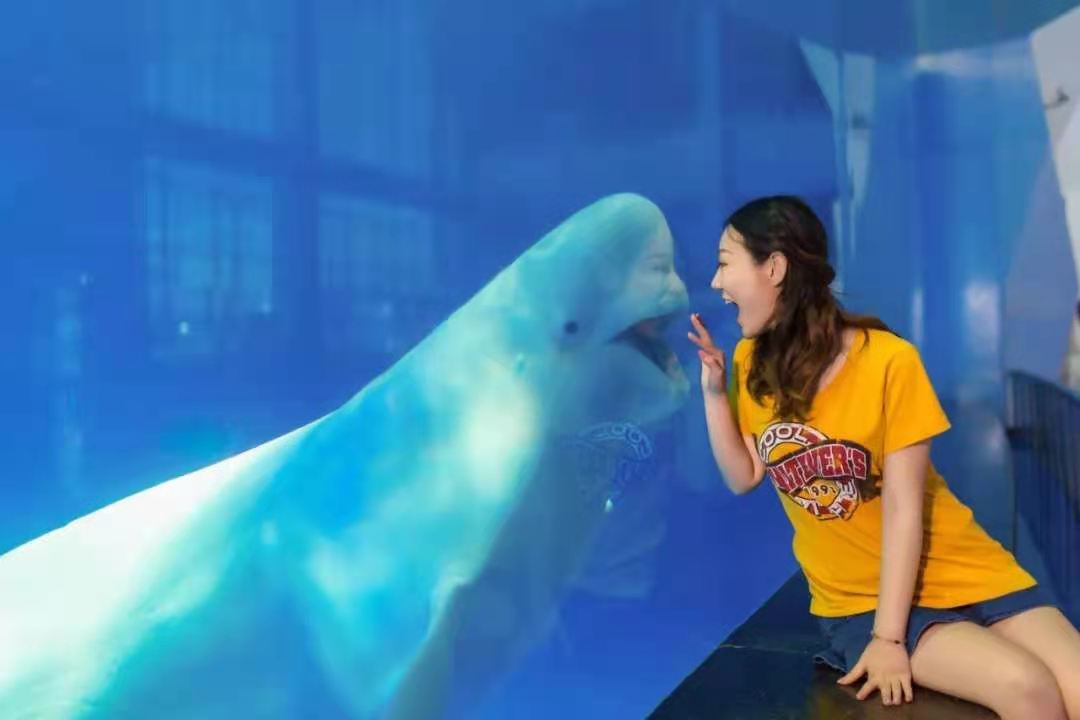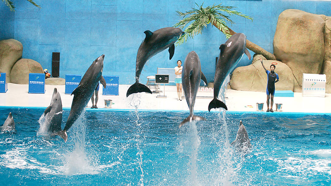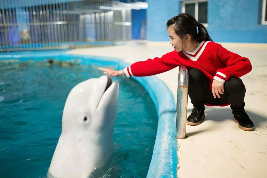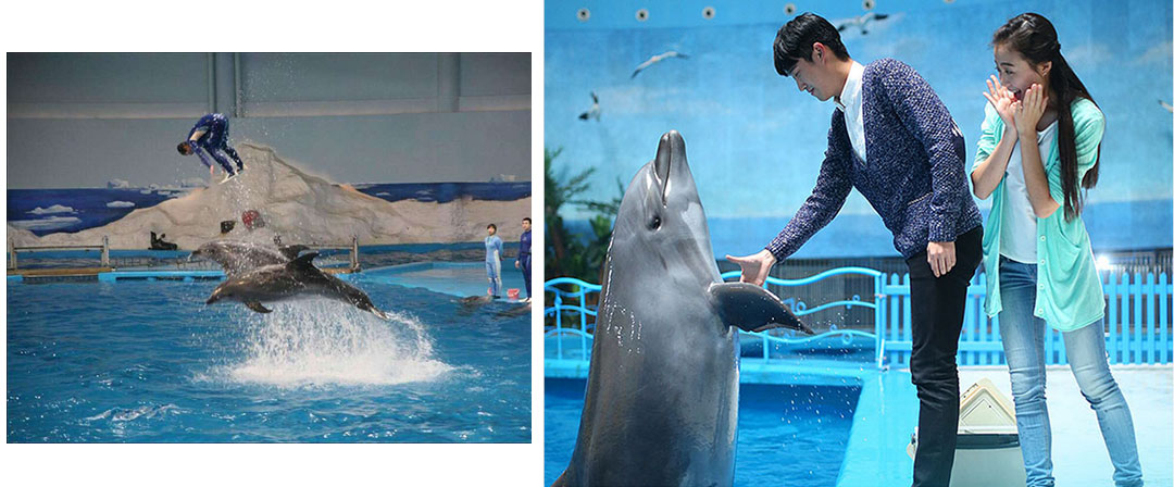 在海洋劇場里有幽默滑稽的海獅表演、驚險(xiǎn)刺激的海豚表演、憨厚可愛的海象表演、浪漫唯美的白鯨表演,四種海洋動物同臺演出,上演八頭海豚高空跳躍、浪漫騎士、激情沖浪、呼啦圈大賽、尾鰭拍球送大禮、高空頂球、人豚共舞、海獅搶凳子、海獅算數(shù)、海獅排球賽、海獅音樂會、海獅空中360°翻轉(zhuǎn)、海象才藝大PK、人鯨共舞等令游客歡欣雀躍的精彩表演。