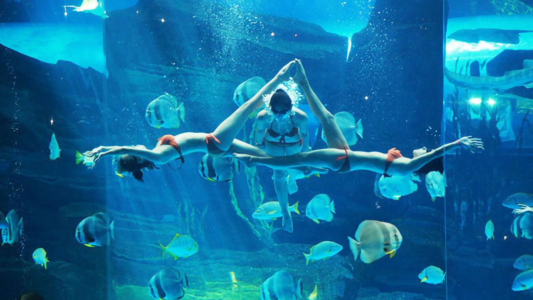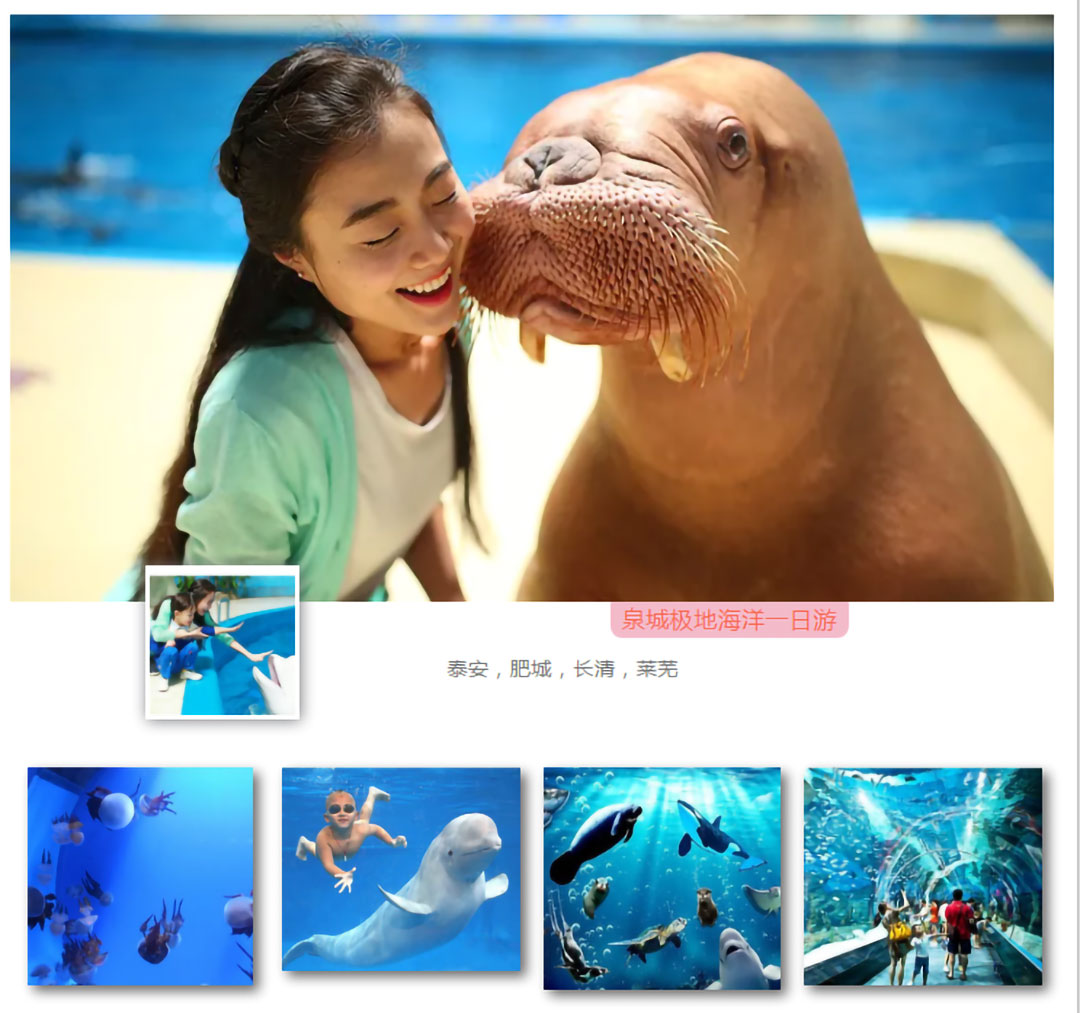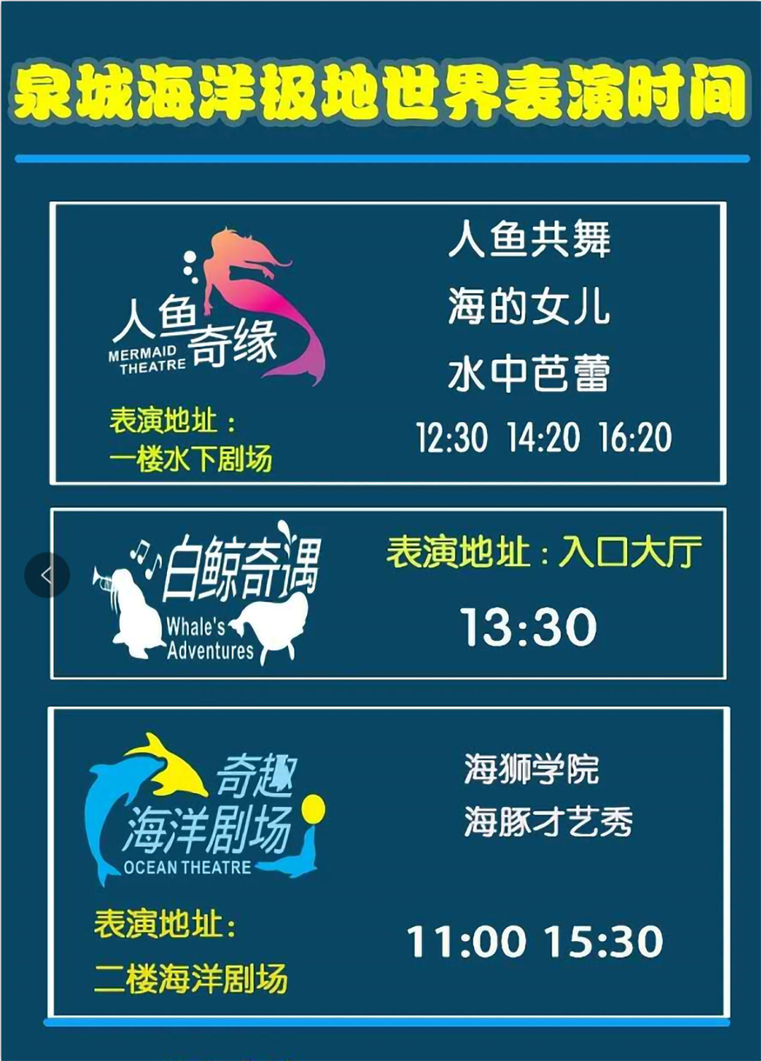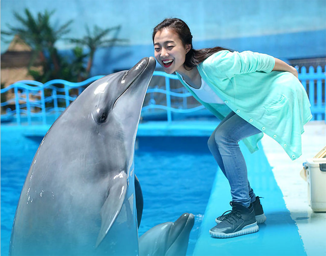 在海洋劇場里有幽默滑稽的海獅表演、驚險(xiǎn)刺激的海豚表演、憨厚可愛的海象表演、浪漫唯美的白鯨表演,四種海洋動物同臺演出,上演八頭海豚高空跳躍、浪漫騎士、激情沖浪、呼啦圈大賽、尾鰭拍球送大禮、高空頂球、人豚共舞、海獅搶凳子、海獅算數(shù)、海獅排球賽、海獅音樂會、海獅空中360°翻轉(zhuǎn)、海象才藝大PK、人鯨共舞等令游客歡欣雀躍的精彩表演。