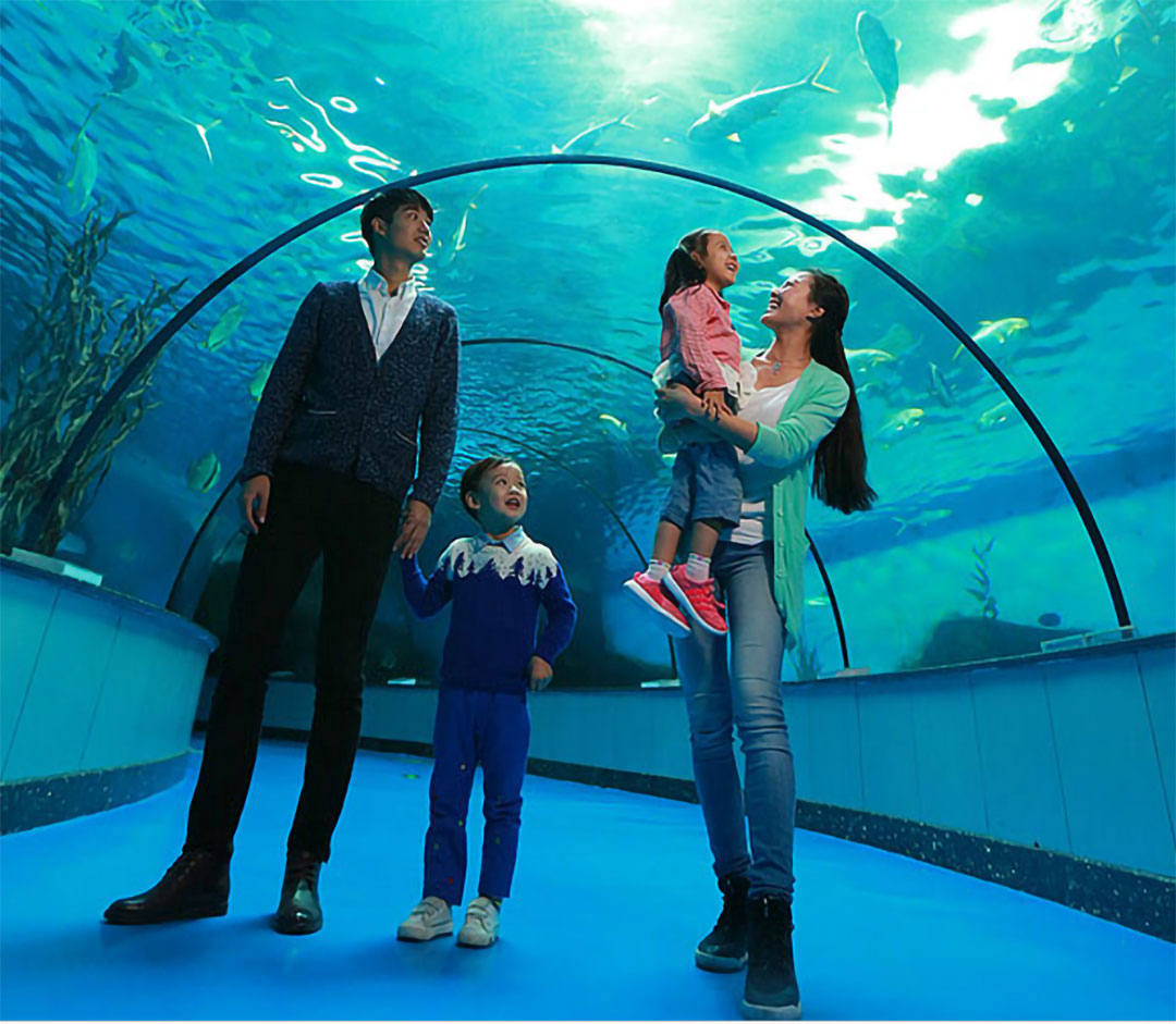 全長100多米,由90度和180度的觀賞視窗組成多邊形隧道。銀鯧、黑背鰩、川紋笛吊、軍曹魚、蘇眉、刺尾藍(lán)吊、巨驁蟹、斑點(diǎn)皺唇鯊、牛港鲹等近千種海洋生物觸手可及;使人們進(jìn)入該區(qū)域后,有溶入海洋之中的感受