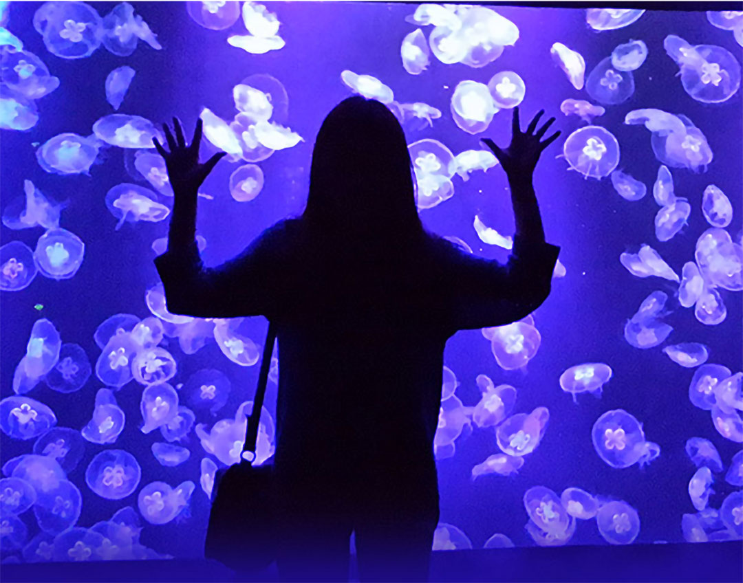 水母身體的主要成分是水,它運(yùn)動起來,細(xì)長的觸手向四周伸展開來,跟著一起漂動,色彩和游泳姿態(tài)美麗極了。在紅、藍(lán)、綠幽暗變幻光氛中,仿佛在和輕盈的水母私語。