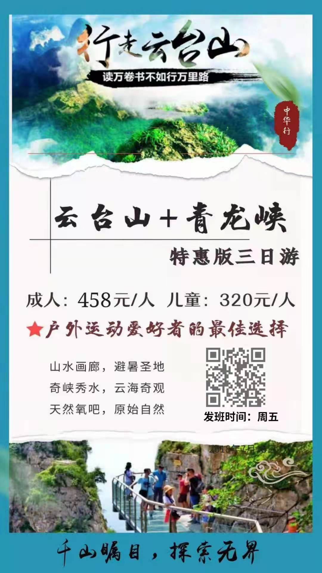 第一天早 點(diǎn) 集合,乘坐豪華空調(diào)旅游車(chē)赴河南焦作修武,(500KM,車(chē)程約6小時(shí)),抵達(dá)后赴世界首批地質(zhì)公園——云臺(tái)山西區(qū)青龍峽,攀登素有“中原第一峽”、“北方張家界”之稱的天然氧吧之稱的中原第一峽——青龍峽,下峽谷游覽旺榮瀑、楊柳瀑、千年榔榆、同心潭、疊翠瀑等領(lǐng)略峽谷極品餐:晚餐 宿:焦作或修武第二天早 集合,乘坐豪華空調(diào)旅游車(chē)赴世界首批地質(zhì)公園——云臺(tái)山 (車(chē)程約20分鐘),游覽華夏第一秀水【潭瀑峽】,游覽蛇潭、素有北方山水世界“小九寨”之稱的小寨溝(約3小時(shí)),觀龍蛇灘、丫字瀑、情人瀑、水簾洞、蝴蝶石、龍鳳壁、品不"老泉"等,在這里你可以感受到“三步一泉,五步一瀑,十步一潭”,之后自由活動(dòng)游覽“泉瀑峽”,在主里你可以觀看到亞洲落差最大的瀑布(單級(jí)落差314米,屬季節(jié)性瀑布)——云臺(tái)天瀑,觀看陳式太極拳表演(整點(diǎn)演出),或游覽國(guó)家級(jí)狝猴自然保護(hù)區(qū)——獼猴谷(約一個(gè)小時(shí)),景區(qū)內(nèi)分布有數(shù)量眾多的野生狝猴群落,并可免費(fèi)參觀獼猴表演;后,游覽云臺(tái)山最高峰,國(guó)家森林公園----【茱萸峰】,相傳唐代大詩(shī)人王維曾在此處寫(xiě)下《九月九日憶山東兄弟》。留下了“獨(dú)在異鄉(xiāng)為異客,每逢佳節(jié)倍思親。遙知兄弟登高處,遍插茱萸少一人”的千古絕句。也可前往鳳凰嶺體驗(yàn)中國(guó)著名的云臺(tái)山【凌云玻璃棧道】。云臺(tái)山玻璃棧道位于茱萸峰鳳凰嶺,建在海拔1000多米的垂直懸崖上。站在玻璃棧道上,整個(gè)人仿佛懸空而立,透過(guò)玻璃往下望去,腳下林木蔥郁、山石嶙峋;極目遠(yuǎn)眺,一馬平川,峰巒如聚,美景盡收眼底。餐:晚餐 宿:焦作或修武第三天早餐后游覽“中原第一奇峽”——紅石峽(全長(zhǎng)約2KM,單行線,全程不走回頭路,游覽約2.-3小時(shí)),欣賞白龍瀑、黑龍洞、懸石、相吻石、含羞石、天女散化瀑等景觀,觀北方罕見(jiàn)景觀鐘乳石,盡情領(lǐng)略“真山、真水、真空氣”,游覽子房湖,中餐后返回溫馨的家!