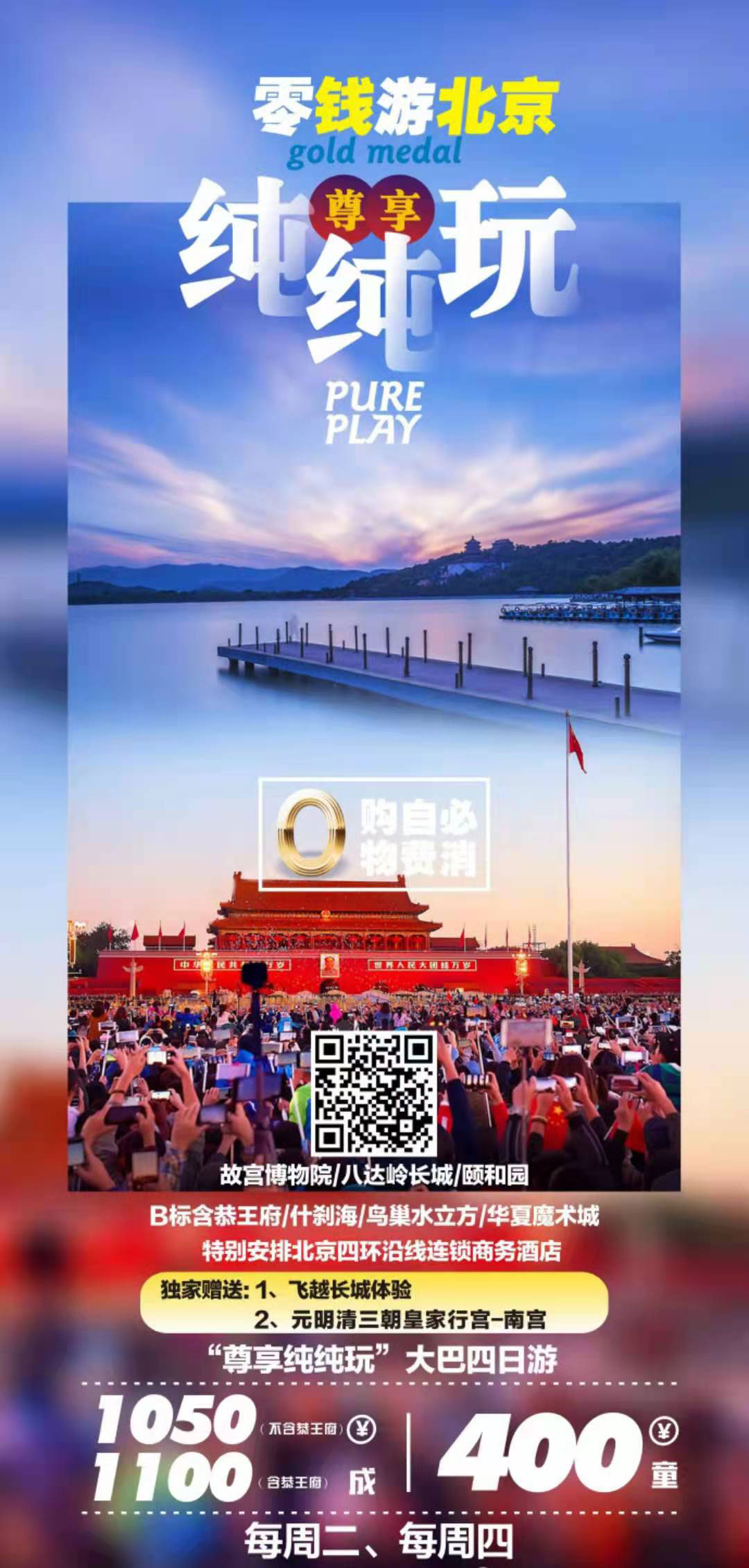 早乘坐空調旅游車赴北京,抵達后游覽現(xiàn)存最美的皇家園林—【頤和園】(游覽時間約90-120分鐘),這座擁山抱水的園林,是清朝皇室的夏宮,是慈禧太后休閑養(yǎng)老之所,用心領會頤養(yǎng)充和、萬壽延年,感受“船在水中走,人在畫中游”的詩情畫意,欣賞碧波蕩漾的昆明湖和層巒疊翠的萬壽山。贈送:外觀【清華大學或北京大學】(約30分鐘),可下車拍照留念,感受名校風采。外觀北京新的地標建筑—【北京奧林匹克塔】外景,北京奧林匹克塔主要承擔城市旅游觀光、環(huán)保監(jiān)測和大型活動監(jiān)控等功能,是世界唯一的有五個獨立的塔組合而成。目前在國內排名第六,在世界排名第22位。游覽【奧林匹克公園】,一個集體育賽事、會議展覽、文化娛樂和休閑購物于一體,空間開敞、綠地環(huán)繞、環(huán)境優(yōu)美,能夠提供多功能服務的市民公共活動中心,近觀2008年奧運會主會場【鳥巢】外景和水藍色夢幻游泳館【水立方】外景,感受鳥巢的雄偉與水立方的靚麗。晚餐后入住酒店。 |