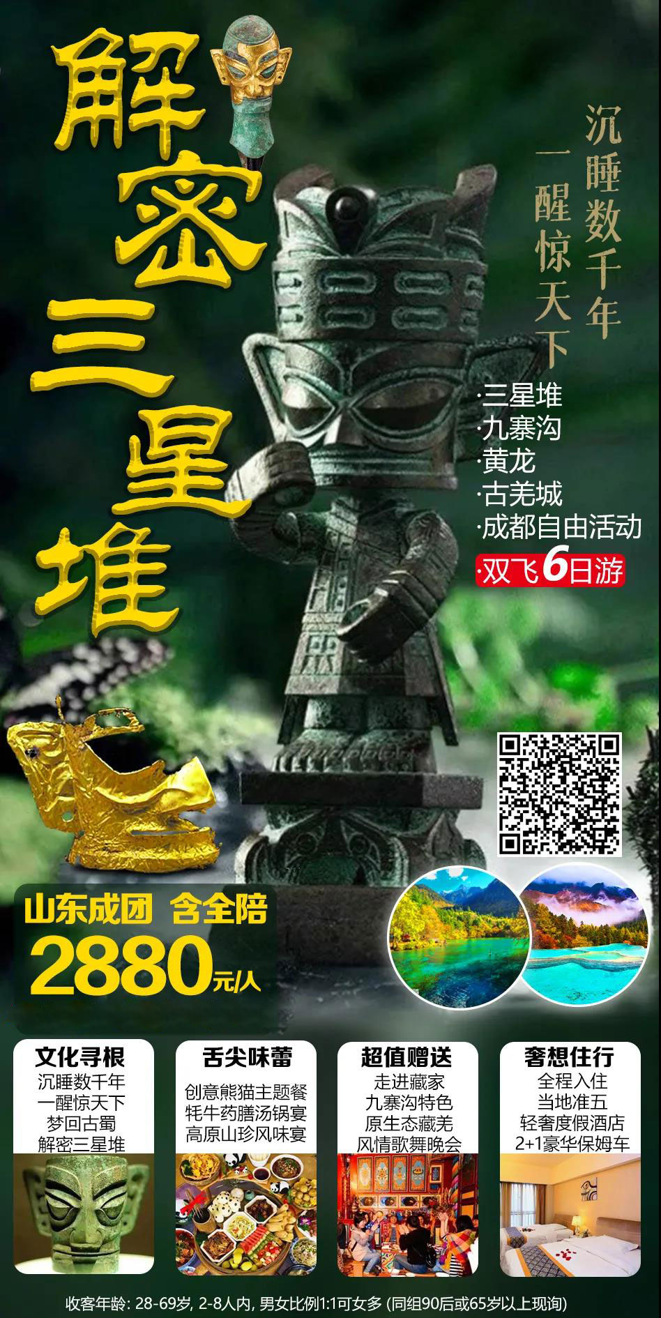 行程中所列景點(diǎn)首道大門(mén)票:三星堆、九寨溝、黃龍
