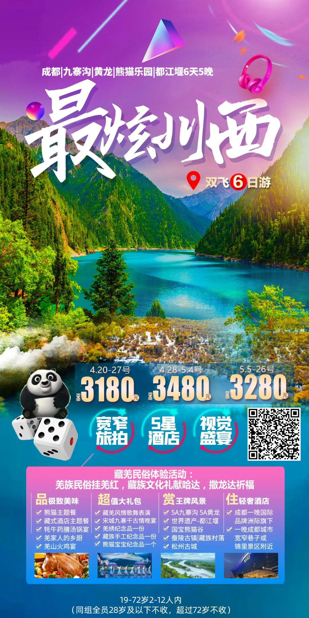 【門票】 九寨溝門票,黃龍門票、都江堰門票、熊貓樂(lè)園門票。 因各景區(qū)為網(wǎng)上訂票,請(qǐng)于報(bào)名時(shí)提供準(zhǔn)確姓名、身份證號(hào)碼及手機(jī)號(hào)。