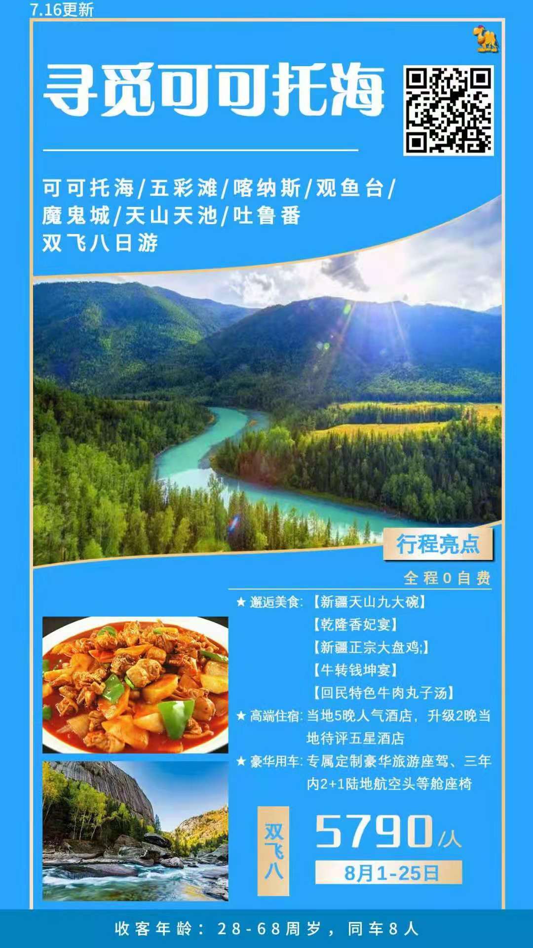 烏魯木齊→ 可可托海→北屯 (680KM 約10小時) 酒店用過早餐后我們開啟今日旅程,乘車前往位于額爾齊斯大峽谷前端的【可可托海國家地質公園】(含區(qū)間車,游覽約2小時左右)可可托海意思為"綠色的叢林"。蒙古語意為"藍色的河灣"。正如其名,可可托海的河水是藍色的和綠色的,這里是全國第二寒極。參觀【白樺林】,野生樺樹林生長在額爾齊斯河凸岸河灣上,嫵媚婆娑,柔軟的枝條舒緩下垂,伴著清風纖纖舞動,綽約若處子,曼妙無比;欣賞【夫妻樹】的植物兩情相悅傳說、網紅景點【神鐘山】,又稱阿米爾薩拉峰,山體光滑如鏡、似一口倒扣的神鈡高聳如云;游畢后我們繼續(xù)乘車前往北屯或福海入住酒店休息。 【餐食安排】中餐:新疆正宗大盤雞宴 【溫馨提示】:1、今日行車時間較長,每餐間隔時間較長,且沿途多為人煙稀少或無人區(qū)域,為避免餓肚,可自備一些小零食;2、可可托海地形復雜,山路崎嶇,注意人身安全,景區(qū)旺季景區(qū)會排隊等候等因素、不可進入登山和森林活動??煽赏泻1环Q為中國第二極寒之地、所以晝夜溫差大,注意增添衣物,即使夏天也應準備保暖外套,如:毛衣、毛褲及厚外套,防止感冒。 |