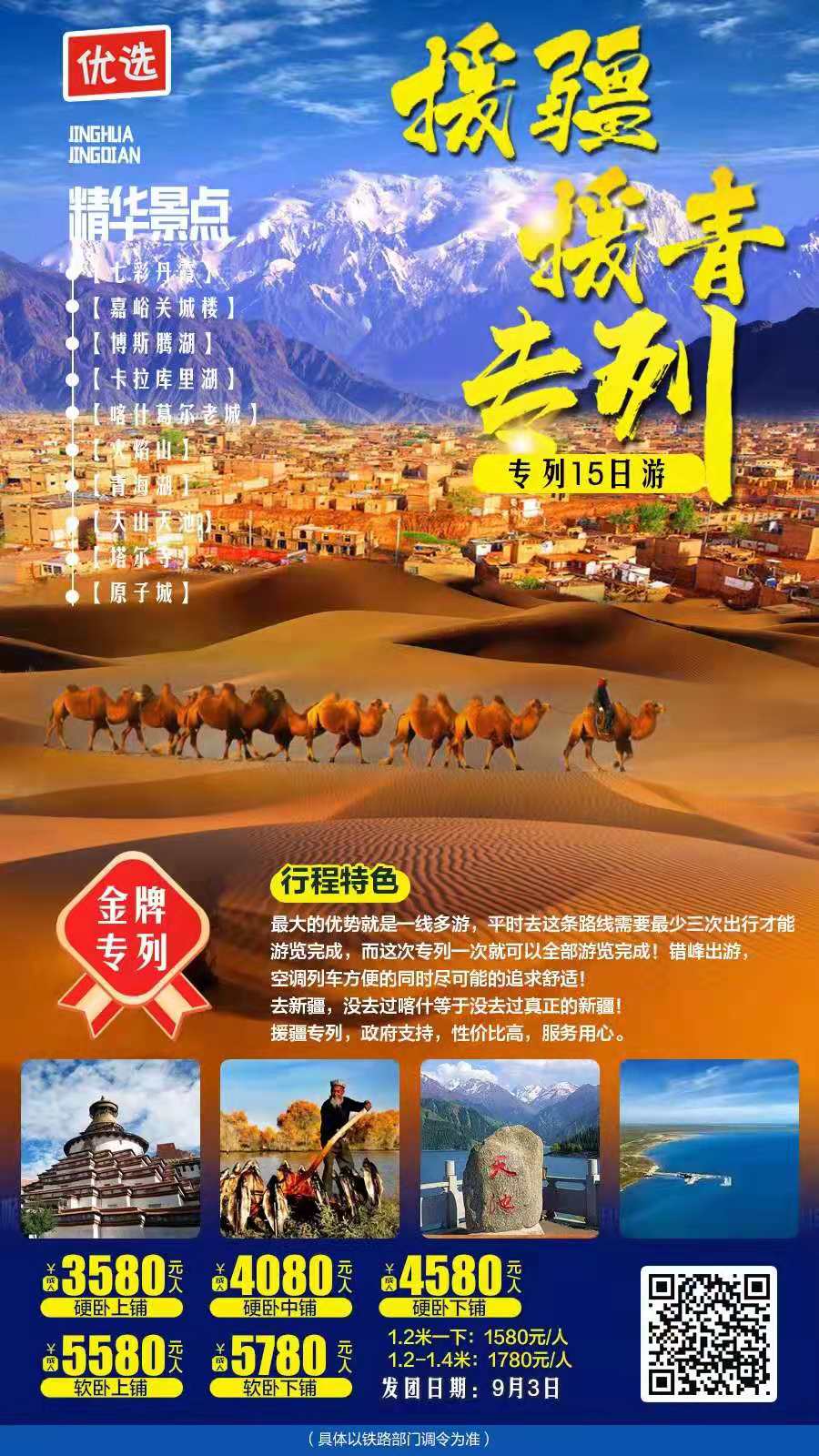 9月12日 早餐后乘車前往歷史文化名城阜康市,參觀市容市貌,抵達(dá)國(guó)家2A級(jí)景區(qū)【碧琳城旅游小鎮(zhèn)】參觀游覽(游覽時(shí)間約30分鐘,贈(zèng)送景點(diǎn),特殊情況不進(jìn)不退)。游覽被譽(yù)為天山明珠的國(guó)家5A級(jí)風(fēng)景區(qū)【天山天池】(游玩時(shí)間約2小時(shí),含乘坐景區(qū)交通時(shí)間),乘坐區(qū)間車路途中可以觀賞天山垂直植物分布帶,車輛經(jīng)過天池門戶石門一線,盤山道上觀賞龍?zhí)侗淘拢恍蕾p頂天三石、南山望雪、西山觀松、定海神針、遠(yuǎn)眺博格達(dá)雪峰;天山天池,雪峰倒映,云杉環(huán)擁,碧水似鏡,風(fēng)光如畫。參觀游覽烏魯木齊【國(guó)際大巴扎】,是世界規(guī)模最大的大巴扎(維吾爾語,意為集市、農(nóng)貿(mào)市場(chǎng)),集伊斯蘭文化、建筑、民族商貿(mào)、娛樂、餐飲于一體,是新疆旅游業(yè)產(chǎn)品的匯集地和展示中心,是“新疆之窗”、“中亞之窗”和“世界之窗”,2004年入選烏魯木齊市“十佳建筑”,具有濃郁的伊斯蘭建筑風(fēng)格,在涵蓋了建筑的功能性和時(shí)代感的基礎(chǔ)上,重現(xiàn)了古絲綢之路的繁華,集中體現(xiàn)了濃郁西域民族特色和地域文化。后乘車前往火車站,乘專列前往西寧